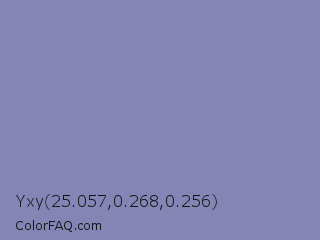 Yxy 25.057,0.268,0.256 Color is a light blue color and the nearest color is Wild Blue Yonder #7a89b8. Hex code #8485b4 and RGB value is rgb(132,133,180). In RGB color space, this color is composed of 52% red, 52% green, 71% blue, In CMYK color space, this color is composed of 27% cyan, 26% magenta, 0% yellow , 29% black , In HSL color space, this color has a hue angle of 239° , 24% saturation and 61% lightness.