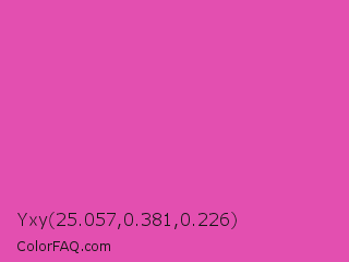 Yxy 25.057,0.381,0.226 Color is a normal magenta color and the nearest color is Brilliant Rose #f653a6. Hex code #e34fb0 and RGB value is rgb(227,79,176). In RGB color space, this color is composed of 89% red, 31% green, 69% blue, In CMYK color space, this color is composed of 0% cyan, 65% magenta, 22% yellow , 11% black , In HSL color space, this color has a hue angle of 321° , 73% saturation and 60% lightness.