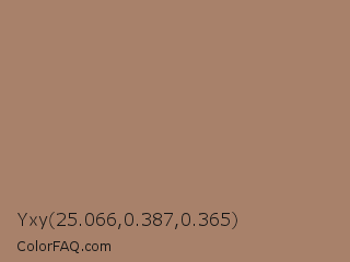 Yxy 25.066,0.387,0.365 Color is a normal orange color and the nearest color is Beaver #9f8170. Hex code #a8816a and RGB value is rgb(168,129,106). In RGB color space, this color is composed of 66% red, 51% green, 42% blue, In CMYK color space, this color is composed of 0% cyan, 23% magenta, 37% yellow , 34% black , In HSL color space, this color has a hue angle of 22° , 26% saturation and 54% lightness.