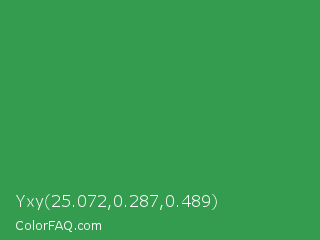 Yxy 25.072,0.287,0.489 Color is a normal green color and the nearest color is Sea Green #2e8b57. Hex code #349c4f and RGB value is rgb(52,156,79). In RGB color space, this color is composed of 20% red, 61% green, 31% blue, In CMYK color space, this color is composed of 67% cyan, 0% magenta, 49% yellow , 39% black , In HSL color space, this color has a hue angle of 136° , 50% saturation and 41% lightness.