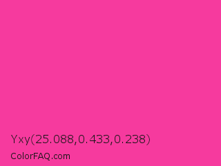 Yxy 25.088,0.433,0.238 Color is a normal rose color and the nearest color is Rose Bonbon #f9429e. Hex code #f63a9e and RGB value is rgb(246,58,158). In RGB color space, this color is composed of 96% red, 23% green, 62% blue, In CMYK color space, this color is composed of 0% cyan, 76% magenta, 36% yellow , 4% black , In HSL color space, this color has a hue angle of 328° , 91% saturation and 60% lightness.