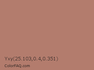 Yxy 25.103,0.4,0.351 Color is a normal red color and the nearest color is Copper Penny #ad6f69. Hex code #b37c6d and RGB value is rgb(179,124,109). In RGB color space, this color is composed of 70% red, 49% green, 43% blue, In CMYK color space, this color is composed of 0% cyan, 31% magenta, 39% yellow , 30% black , In HSL color space, this color has a hue angle of 13° , 32% saturation and 56% lightness.