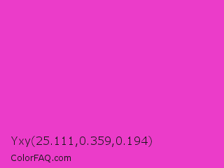 Yxy 25.111,0.359,0.194 Color is a normal magenta color and the nearest color is Razzle Dazzle Rose #ff33cc. Hex code #eb3cc9 and RGB value is rgb(235,60,201). In RGB color space, this color is composed of 92% red, 24% green, 79% blue, In CMYK color space, this color is composed of 0% cyan, 74% magenta, 14% yellow , 8% black , In HSL color space, this color has a hue angle of 312° , 81% saturation and 58% lightness.