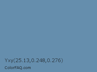 Yxy 25.13,0.248,0.276 Color is a normal blue color and the nearest color is Air Force Blue RAF #5d8aa8. Hex code #658ead and RGB value is rgb(101,142,173). In RGB color space, this color is composed of 40% red, 56% green, 68% blue, In CMYK color space, this color is composed of 42% cyan, 18% magenta, 0% yellow , 32% black , In HSL color space, this color has a hue angle of 206° , 31% saturation and 54% lightness.