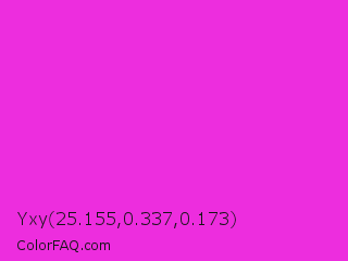 Yxy 25.155,0.337,0.173 Color is a normal magenta color and the nearest color is Razzle Dazzle Rose #ff33cc. Hex code #ed2dde and RGB value is rgb(237,45,222). In RGB color space, this color is composed of 93% red, 18% green, 87% blue, In CMYK color space, this color is composed of 0% cyan, 81% magenta, 6% yellow , 7% black , In HSL color space, this color has a hue angle of 305° , 84% saturation and 55% lightness.