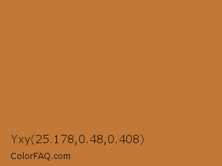 Yxy 25.178,0.48,0.408 Color is a normal orange color and the nearest color is Copper #b87333. Hex code #c27837 and RGB value is rgb(194,120,55). In RGB color space, this color is composed of 76% red, 47% green, 22% blue, In CMYK color space, this color is composed of 0% cyan, 38% magenta, 72% yellow , 24% black , In HSL color space, this color has a hue angle of 28° , 56% saturation and 49% lightness.