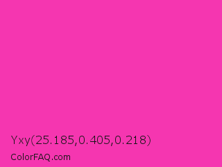 Yxy 25.185,0.405,0.218 Color is a normal magenta color and the nearest color is Frostbite #e936a7. Hex code #f536b0 and RGB value is rgb(245,54,176). In RGB color space, this color is composed of 96% red, 21% green, 69% blue, In CMYK color space, this color is composed of 0% cyan, 78% magenta, 28% yellow , 4% black , In HSL color space, this color has a hue angle of 322° , 91% saturation and 59% lightness.