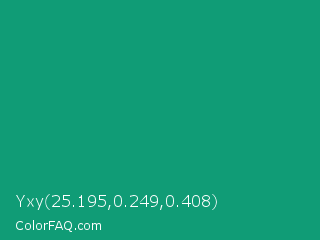 Yxy 25.195,0.249,0.408 Color is a normal cyan color and the nearest color is Gossamer #069b81. Hex code #109c76 and RGB value is rgb(16,156,118). In RGB color space, this color is composed of 6% red, 61% green, 46% blue, In CMYK color space, this color is composed of 90% cyan, 0% magenta, 24% yellow , 39% black , In HSL color space, this color has a hue angle of 164° , 81% saturation and 34% lightness.