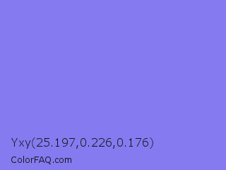 Yxy 25.197,0.226,0.176 Color is a light indigo color and the nearest color is Medium Slate Blue #7b68ee. Hex code #857af0 and RGB value is rgb(133,122,240). In RGB color space, this color is composed of 52% red, 48% green, 94% blue, In CMYK color space, this color is composed of 45% cyan, 49% magenta, 0% yellow , 6% black , In HSL color space, this color has a hue angle of 246° , 80% saturation and 71% lightness.