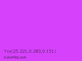 Yxy 25.221,0.283,0.151 Color is a light purple color and the nearest color is Heliotrope #df73ff. Hex code #d642fc and RGB value is rgb(214,66,252). In RGB color space, this color is composed of 84% red, 26% green, 99% blue, In CMYK color space, this color is composed of 15% cyan, 74% magenta, 0% yellow , 1% black , In HSL color space, this color has a hue angle of 288° , 97% saturation and 62% lightness.
