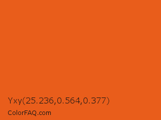 Yxy 25.236,0.564,0.377 Color is a normal orange color and the nearest color is Vivid Vermilion #e56024. Hex code #e95d1b and RGB value is rgb(233,93,27). In RGB color space, this color is composed of 91% red, 36% green, 11% blue, In CMYK color space, this color is composed of 0% cyan, 60% magenta, 88% yellow , 9% black , In HSL color space, this color has a hue angle of 19° , 82% saturation and 51% lightness.