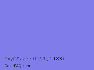 Yxy 25.255,0.226,0.183 Color is a light indigo color and the nearest color is Chetwode Blue #8581d9. Hex code #807deb and RGB value is rgb(128,125,235). In RGB color space, this color is composed of 50% red, 49% green, 92% blue, In CMYK color space, this color is composed of 46% cyan, 47% magenta, 0% yellow , 8% black , In HSL color space, this color has a hue angle of 242° , 73% saturation and 71% lightness.