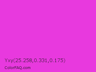 Yxy 25.258,0.331,0.175 Color is a normal magenta color and the nearest color is Razzle Dazzle Rose #ff33cc. Hex code #e839de and RGB value is rgb(232,57,222). In RGB color space, this color is composed of 91% red, 22% green, 87% blue, In CMYK color space, this color is composed of 0% cyan, 75% magenta, 4% yellow , 9% black , In HSL color space, this color has a hue angle of 303° , 79% saturation and 57% lightness.