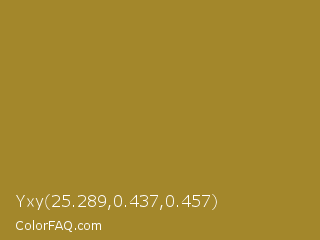 Yxy 25.289,0.437,0.457 Color is a normal yellow color and the nearest color is Luxor Gold #a7882c. Hex code #a3872b and RGB value is rgb(163,135,43). In RGB color space, this color is composed of 64% red, 53% green, 17% blue, In CMYK color space, this color is composed of 0% cyan, 17% magenta, 74% yellow , 36% black , In HSL color space, this color has a hue angle of 46° , 58% saturation and 40% lightness.