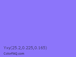 Yxy 25.2,0.225,0.165 Color is a light indigo color and the nearest color is Medium Slate Blue #7b68ee. Hex code #8c75fa and RGB value is rgb(140,117,250). In RGB color space, this color is composed of 55% red, 46% green, 98% blue, In CMYK color space, this color is composed of 44% cyan, 53% magenta, 0% yellow , 2% black , In HSL color space, this color has a hue angle of 250° , 93% saturation and 72% lightness.