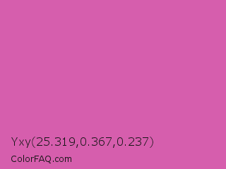 Yxy 25.319,0.367,0.237 Color is a normal magenta color and the nearest color is Super Pink #cf6ba9. Hex code #d65ead and RGB value is rgb(214,94,173). In RGB color space, this color is composed of 84% red, 37% green, 68% blue, In CMYK color space, this color is composed of 0% cyan, 56% magenta, 19% yellow , 16% black , In HSL color space, this color has a hue angle of 321° , 59% saturation and 60% lightness.