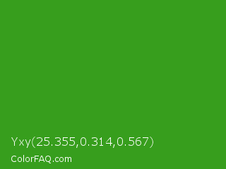 Yxy 25.355,0.314,0.567 Color is a normal green color and the nearest color is Slimy Green #299617. Hex code #379e1d and RGB value is rgb(55,158,29). In RGB color space, this color is composed of 22% red, 62% green, 11% blue, In CMYK color space, this color is composed of 65% cyan, 0% magenta, 82% yellow , 38% black , In HSL color space, this color has a hue angle of 108° , 69% saturation and 37% lightness.