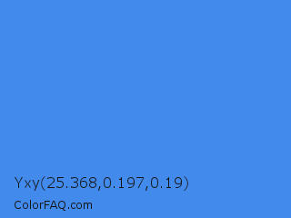 Yxy 25.368,0.197,0.19 Color is a normal blue color and the nearest color is Tufts Blue #3e8ede. Hex code #428aeb and RGB value is rgb(66,138,235). In RGB color space, this color is composed of 26% red, 54% green, 92% blue, In CMYK color space, this color is composed of 72% cyan, 41% magenta, 0% yellow , 8% black , In HSL color space, this color has a hue angle of 214° , 81% saturation and 59% lightness.