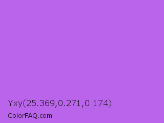 Yxy 25.369,0.271,0.174 Color is a light purple color and the nearest color is Rich Lilac #b666d2. Hex code #b964ea and RGB value is rgb(185,100,234). In RGB color space, this color is composed of 73% red, 39% green, 92% blue, In CMYK color space, this color is composed of 21% cyan, 57% magenta, 0% yellow , 8% black , In HSL color space, this color has a hue angle of 278° , 76% saturation and 65% lightness.