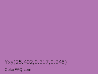 Yxy 25.402,0.317,0.246 Color is a normal magenta color and the nearest color is African Violet #b284be. Hex code #b275b2 and RGB value is rgb(178,117,178). In RGB color space, this color is composed of 70% red, 46% green, 70% blue, In CMYK color space, this color is composed of 0% cyan, 34% magenta, 0% yellow , 30% black , In HSL color space, this color has a hue angle of 300° , 28% saturation and 58% lightness.