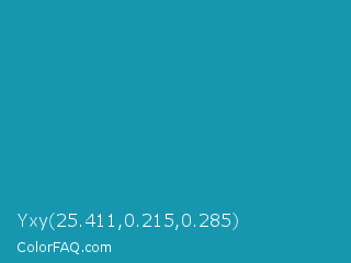 Yxy 25.411,0.215,0.285 Color is a normal cyan color and the nearest color is Eastern Blue #1e9ab0. Hex code #1797af and RGB value is rgb(23,151,175). In RGB color space, this color is composed of 9% red, 59% green, 69% blue, In CMYK color space, this color is composed of 87% cyan, 14% magenta, 0% yellow , 31% black , In HSL color space, this color has a hue angle of 189° , 77% saturation and 39% lightness.