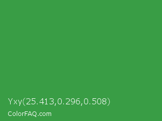 Yxy 25.413,0.296,0.508 Color is a normal green color and the nearest color is May Green #4c9141. Hex code #399d45 and RGB value is rgb(57,157,69). In RGB color space, this color is composed of 22% red, 62% green, 27% blue, In CMYK color space, this color is composed of 64% cyan, 0% magenta, 56% yellow , 38% black , In HSL color space, this color has a hue angle of 127° , 47% saturation and 42% lightness.