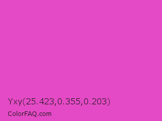 Yxy 25.423,0.355,0.203 Color is a normal magenta color and the nearest color is Light Deep Pink #ff5ccd. Hex code #e44ac5 and RGB value is rgb(228,74,197). In RGB color space, this color is composed of 89% red, 29% green, 77% blue, In CMYK color space, this color is composed of 0% cyan, 68% magenta, 14% yellow , 11% black , In HSL color space, this color has a hue angle of 312° , 74% saturation and 59% lightness.