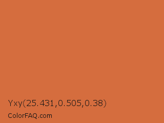 Yxy 25.431,0.505,0.38 Color is a normal orange color and the nearest color is Red Damask #da6a41. Hex code #d56d3e and RGB value is rgb(213,109,62). In RGB color space, this color is composed of 84% red, 43% green, 24% blue, In CMYK color space, this color is composed of 0% cyan, 49% magenta, 71% yellow , 16% black , In HSL color space, this color has a hue angle of 19° , 64% saturation and 54% lightness.