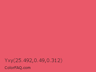 Yxy 25.492,0.49,0.312 Color is a light red color and the nearest color is Mandy #e25465. Hex code #ea5869 and RGB value is rgb(234,88,105). In RGB color space, this color is composed of 92% red, 35% green, 41% blue, In CMYK color space, this color is composed of 0% cyan, 62% magenta, 55% yellow , 8% black , In HSL color space, this color has a hue angle of 353° , 78% saturation and 63% lightness.