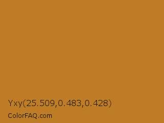 Yxy 25.509,0.483,0.428 Color is a normal orange color and the nearest color is University Of California Gold #b78727. Hex code #be7c27 and RGB value is rgb(190,124,39). In RGB color space, this color is composed of 75% red, 49% green, 15% blue, In CMYK color space, this color is composed of 0% cyan, 35% magenta, 79% yellow , 25% black , In HSL color space, this color has a hue angle of 34° , 66% saturation and 45% lightness.