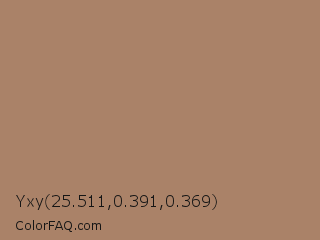 Yxy 25.511,0.391,0.369 Color is a normal orange color and the nearest color is Sandal #aa8d6f. Hex code #aa8268 and RGB value is rgb(170,130,104). In RGB color space, this color is composed of 67% red, 51% green, 41% blue, In CMYK color space, this color is composed of 0% cyan, 24% magenta, 39% yellow , 33% black , In HSL color space, this color has a hue angle of 24° , 28% saturation and 54% lightness.