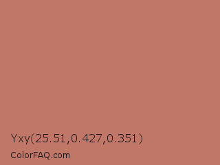 Yxy 25.51,0.427,0.351 Color is a normal red color and the nearest color is Contessa #c6726b. Hex code #c17767 and RGB value is rgb(193,119,103). In RGB color space, this color is composed of 76% red, 47% green, 40% blue, In CMYK color space, this color is composed of 0% cyan, 38% magenta, 47% yellow , 24% black , In HSL color space, this color has a hue angle of 11° , 42% saturation and 58% lightness.