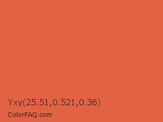 Yxy 25.51,0.521,0.36 Color is a normal red color and the nearest color is Red Damask #da6a41. Hex code #e26344 and RGB value is rgb(226,99,68). In RGB color space, this color is composed of 89% red, 39% green, 27% blue, In CMYK color space, this color is composed of 0% cyan, 56% magenta, 70% yellow , 11% black , In HSL color space, this color has a hue angle of 12° , 73% saturation and 58% lightness.