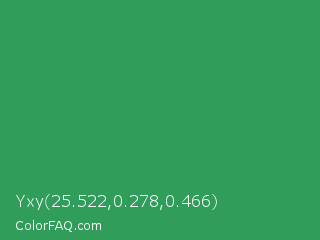 Yxy 25.522,0.278,0.466 Color is a normal green color and the nearest color is Sea Green #2e8b57. Hex code #319d5b and RGB value is rgb(49,157,91). In RGB color space, this color is composed of 19% red, 62% green, 36% blue, In CMYK color space, this color is composed of 69% cyan, 0% magenta, 42% yellow , 38% black , In HSL color space, this color has a hue angle of 143° , 52% saturation and 40% lightness.