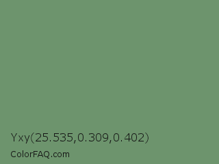 Yxy 25.535,0.309,0.402 Color is a normal green color and the nearest color is Russian Green #679267. Hex code #6d946d and RGB value is rgb(109,148,109). In RGB color space, this color is composed of 43% red, 58% green, 43% blue, In CMYK color space, this color is composed of 26% cyan, 0% magenta, 26% yellow , 42% black , In HSL color space, this color has a hue angle of 120° , 15% saturation and 50% lightness.