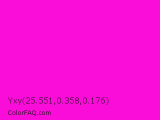 Yxy 25.551,0.358,0.176 Color is a normal magenta color and the nearest color is Purple Pizzazz #ff00cc. Hex code #fa0cd9 and RGB value is rgb(250,12,217). In RGB color space, this color is composed of 98% red, 5% green, 85% blue, In CMYK color space, this color is composed of 0% cyan, 95% magenta, 13% yellow , 2% black , In HSL color space, this color has a hue angle of 308° , 96% saturation and 51% lightness.