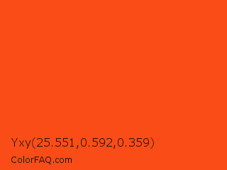 Yxy 25.551,0.592,0.359 Color is a normal red color and the nearest color is Orioles Orange #fb4f14. Hex code #fa4c16 and RGB value is rgb(250,76,22). In RGB color space, this color is composed of 98% red, 30% green, 9% blue, In CMYK color space, this color is composed of 0% cyan, 70% magenta, 91% yellow , 2% black , In HSL color space, this color has a hue angle of 14° , 96% saturation and 53% lightness.