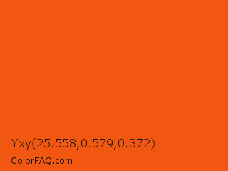 Yxy 25.558,0.579,0.372 Color is a normal orange color and the nearest color is Orioles Orange #fb4f14. Hex code #f15711 and RGB value is rgb(241,87,17). In RGB color space, this color is composed of 95% red, 34% green, 7% blue, In CMYK color space, this color is composed of 0% cyan, 64% magenta, 93% yellow , 5% black , In HSL color space, this color has a hue angle of 19° , 89% saturation and 51% lightness.