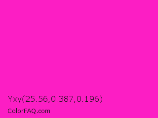 Yxy 25.56,0.387,0.196 Color is a normal magenta color and the nearest color is Hot Magenta #ff1dce. Hex code #fc1ec4 and RGB value is rgb(252,30,196). In RGB color space, this color is composed of 99% red, 12% green, 77% blue, In CMYK color space, this color is composed of 0% cyan, 88% magenta, 22% yellow , 1% black , In HSL color space, this color has a hue angle of 315° , 97% saturation and 55% lightness.