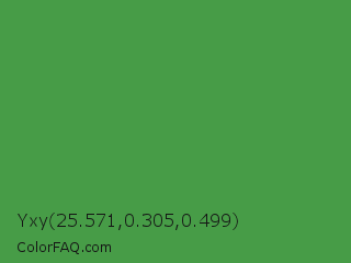 Yxy 25.571,0.305,0.499 Color is a normal green color and the nearest color is May Green #4c9141. Hex code #479c47 and RGB value is rgb(71,156,71). In RGB color space, this color is composed of 28% red, 61% green, 28% blue, In CMYK color space, this color is composed of 54% cyan, 0% magenta, 54% yellow , 39% black , In HSL color space, this color has a hue angle of 120° , 37% saturation and 45% lightness.