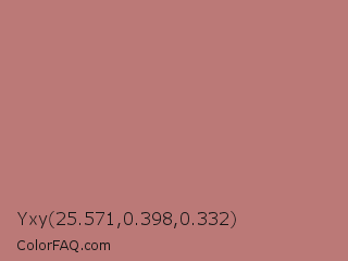Yxy 25.571,0.398,0.332 Color is a normal red color and the nearest color is Rose Gold #b76e79. Hex code #bb7977 and RGB value is rgb(187,121,119). In RGB color space, this color is composed of 73% red, 47% green, 47% blue, In CMYK color space, this color is composed of 0% cyan, 35% magenta, 36% yellow , 27% black , In HSL color space, this color has a hue angle of 2° , 33% saturation and 60% lightness.
