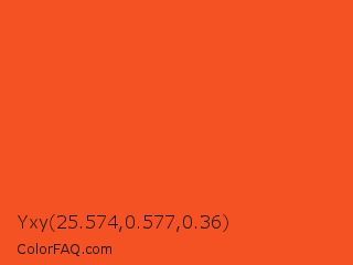 Yxy 25.574,0.577,0.36 Color is a normal red color and the nearest color is Flamingo #f2552a. Hex code #f55224 and RGB value is rgb(245,82,36). In RGB color space, this color is composed of 96% red, 32% green, 14% blue, In CMYK color space, this color is composed of 0% cyan, 67% magenta, 85% yellow , 4% black , In HSL color space, this color has a hue angle of 13° , 91% saturation and 55% lightness.