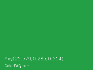 Yxy 25.579,0.285,0.514 Color is a normal green color and the nearest color is Sea Green #2e8b57. Hex code #239f46 and RGB value is rgb(35,159,70). In RGB color space, this color is composed of 14% red, 62% green, 27% blue, In CMYK color space, this color is composed of 78% cyan, 0% magenta, 56% yellow , 38% black , In HSL color space, this color has a hue angle of 137° , 64% saturation and 38% lightness.