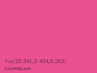 Yxy 25.591,0.434,0.263 Color is a light rose color and the nearest color is Raspberry Pink #e25098. Hex code #eb5191 and RGB value is rgb(235,81,145). In RGB color space, this color is composed of 92% red, 32% green, 57% blue, In CMYK color space, this color is composed of 0% cyan, 66% magenta, 38% yellow , 8% black , In HSL color space, this color has a hue angle of 335° , 79% saturation and 62% lightness.