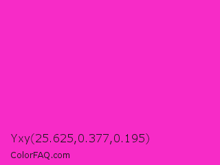 Yxy 25.625,0.377,0.195 Color is a normal magenta color and the nearest color is Razzle Dazzle Rose #ff33cc. Hex code #f72bc7 and RGB value is rgb(247,43,199). In RGB color space, this color is composed of 97% red, 17% green, 78% blue, In CMYK color space, this color is composed of 0% cyan, 83% magenta, 19% yellow , 3% black , In HSL color space, this color has a hue angle of 314° , 93% saturation and 57% lightness.