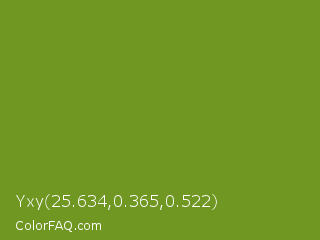 Yxy 25.634,0.365,0.522 Color is a normal green color and the nearest color is Olive Drab #6b8e23. Hex code #6f9722 and RGB value is rgb(111,151,34). In RGB color space, this color is composed of 44% red, 59% green, 13% blue, In CMYK color space, this color is composed of 26% cyan, 0% magenta, 77% yellow , 41% black , In HSL color space, this color has a hue angle of 81° , 63% saturation and 36% lightness.