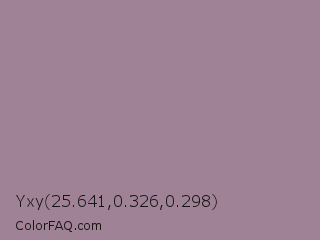 Yxy 25.641,0.326,0.298 Color is a normal magenta color and the nearest color is Mountbatten Pink #997a8d. Hex code #a08296 and RGB value is rgb(160,130,150). In RGB color space, this color is composed of 63% red, 51% green, 59% blue, In CMYK color space, this color is composed of 0% cyan, 19% magenta, 6% yellow , 37% black , In HSL color space, this color has a hue angle of 320° , 14% saturation and 57% lightness.