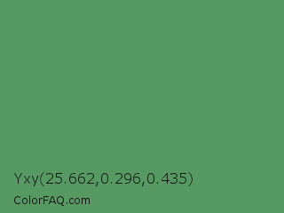 Yxy 25.662,0.296,0.435 Color is a normal green color and the nearest color is Fruit Salad #4f9d5d. Hex code #569963 and RGB value is rgb(86,153,99). In RGB color space, this color is composed of 34% red, 60% green, 39% blue, In CMYK color space, this color is composed of 44% cyan, 0% magenta, 35% yellow , 40% black , In HSL color space, this color has a hue angle of 132° , 28% saturation and 47% lightness.