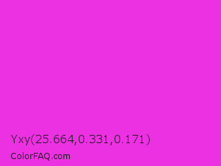 Yxy 25.664,0.331,0.171 Color is a normal magenta color and the nearest color is Razzle Dazzle Rose #ff33cc. Hex code #ec31e3 and RGB value is rgb(236,49,227). In RGB color space, this color is composed of 93% red, 19% green, 89% blue, In CMYK color space, this color is composed of 0% cyan, 79% magenta, 4% yellow , 7% black , In HSL color space, this color has a hue angle of 303° , 83% saturation and 56% lightness.