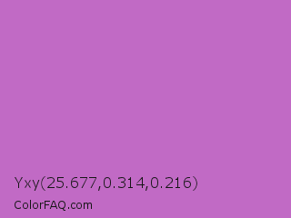 Yxy 25.677,0.314,0.216 Color is a normal magenta color and the nearest color is Rich Lilac #b666d2. Hex code #c16ac5 and RGB value is rgb(193,106,197). In RGB color space, this color is composed of 76% red, 42% green, 77% blue, In CMYK color space, this color is composed of 2% cyan, 46% magenta, 0% yellow , 23% black , In HSL color space, this color has a hue angle of 297° , 44% saturation and 59% lightness.